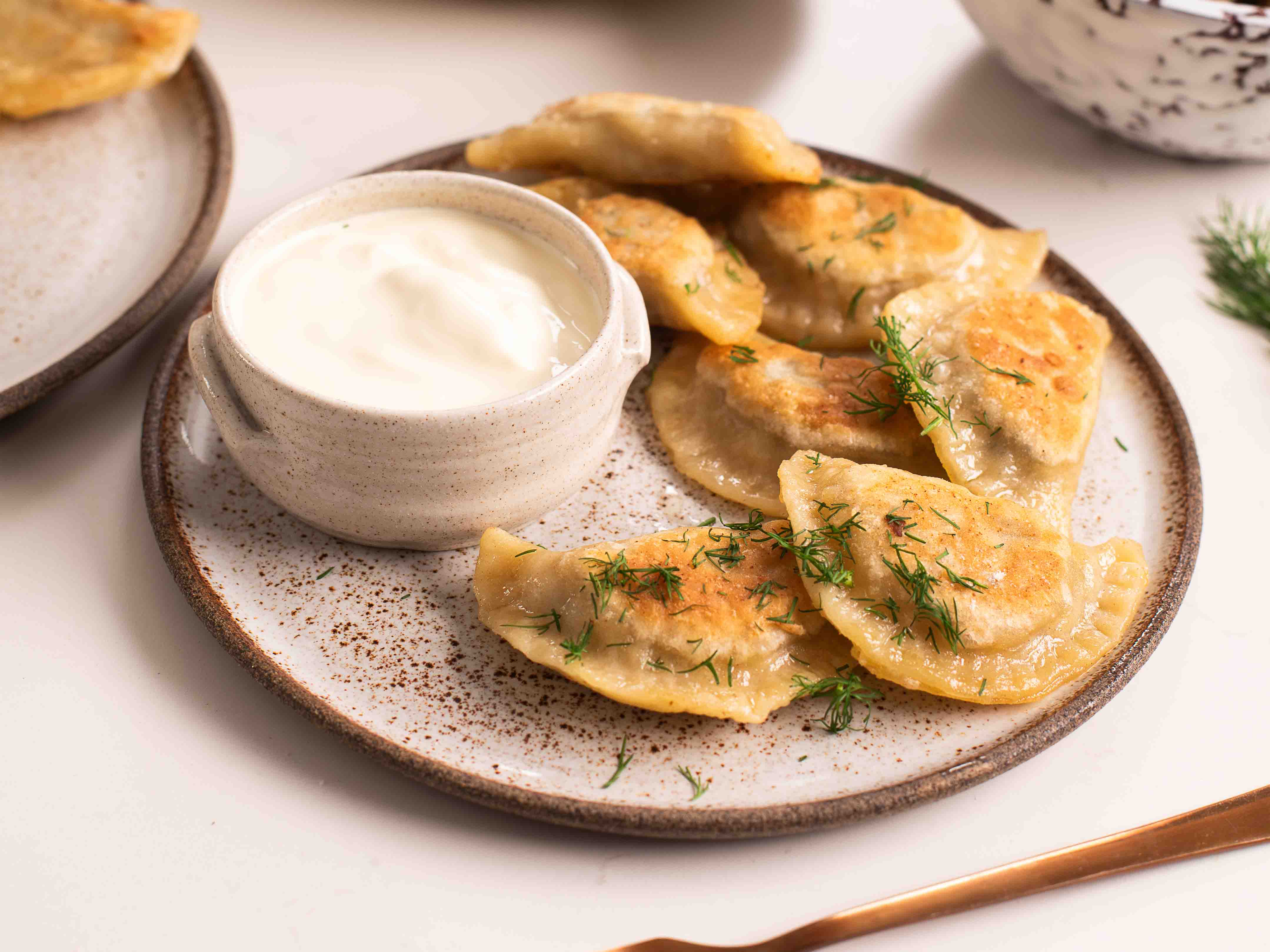 Para terminar, derreta 30 g de manteiga numa frigideira e frite os pierogis cozidos até ficarem estaladiços e dourados no exterior. Sirva com endro fresco.