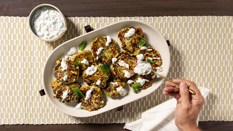 Bolinhos fritos de curgete e hortelã com molho de iogurte de hortelã