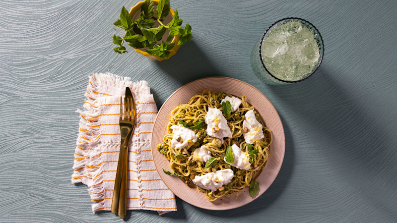 Esparguete com pesto de hortelã e burrata